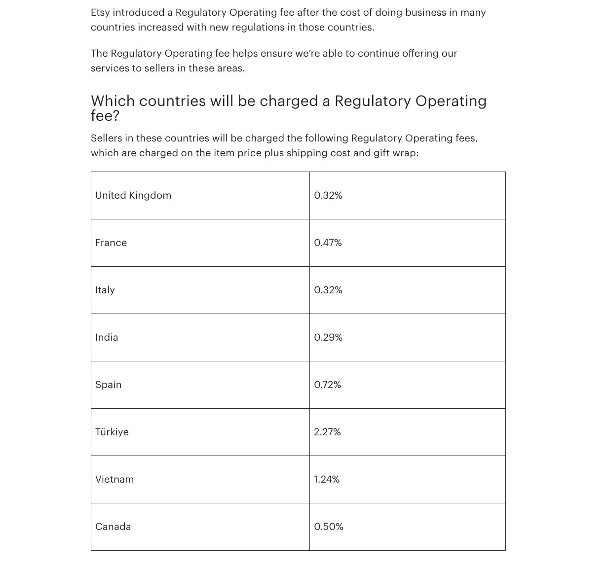 Another fee is the Regulatory Operating Fee. This varies according to the “seller location,” i.e., the location of the shop owner. Depending on which country the shop owner is located in (United Kingdom: 0.32%, France: 0.47%, Italy: 0.32%, Spain: 0.72%, Turkey: 2.27%), Etsy’s fees change. Etsy does not take this deduction from the USA; it only applies to specific countries.